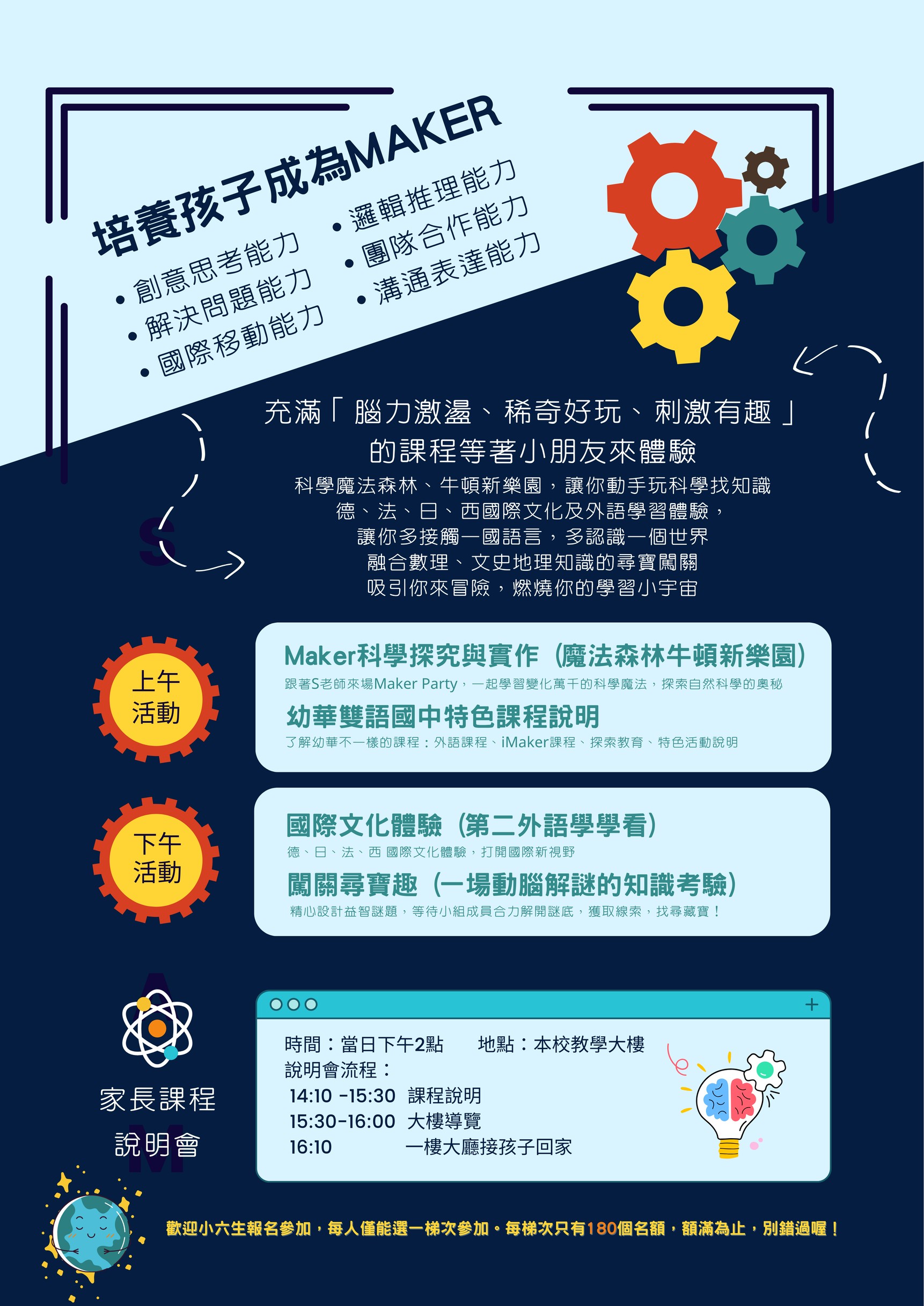 說明: 一、活動日期:115年1月24日(六)、1月31日(六),共二梯次。 (擇一場次參加) 二、活動地點:臺北市幼華雙語國中(臺北市北投區北投路二段 55號,北投捷運站旁) 三、報名資格:國小六年級應屆畢業生。 四、活動費用:免費參加。 五、報名方式:114年12月8日,上午10點起,請至本校網頁: http://rpage.yh.tp.edu.tw/ 線上報名。 六、檢附「2026幼華創客國際科學營」活動簡章電子檔,惠請 協助於貴校網頁連結公告。