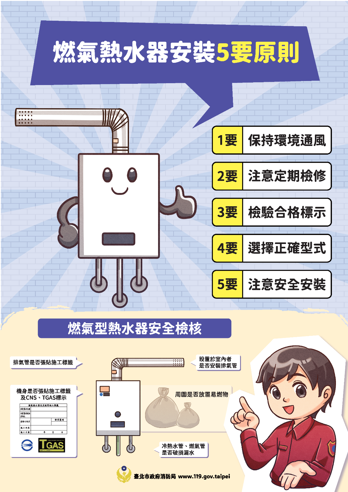 冬天是一氧化碳中毒的高峰期,為防範一氧化碳中毒,安裝燃氣熱水器要遵循「5要原則」要保持環境通風、要注意定期檢修、要檢驗合格標示、要選擇正確型式、要注意安全安裝,以確保居家安全。