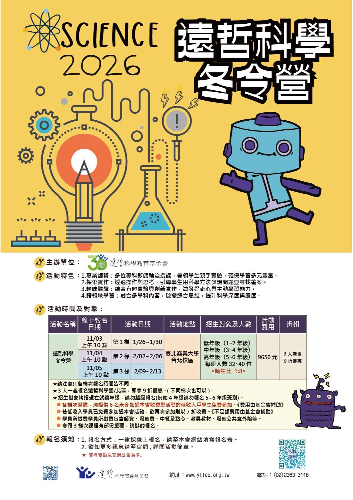 財團法人遠哲科學教育基金會舉辦「2026遠哲科學冬令營」,歡迎踴躍參加。