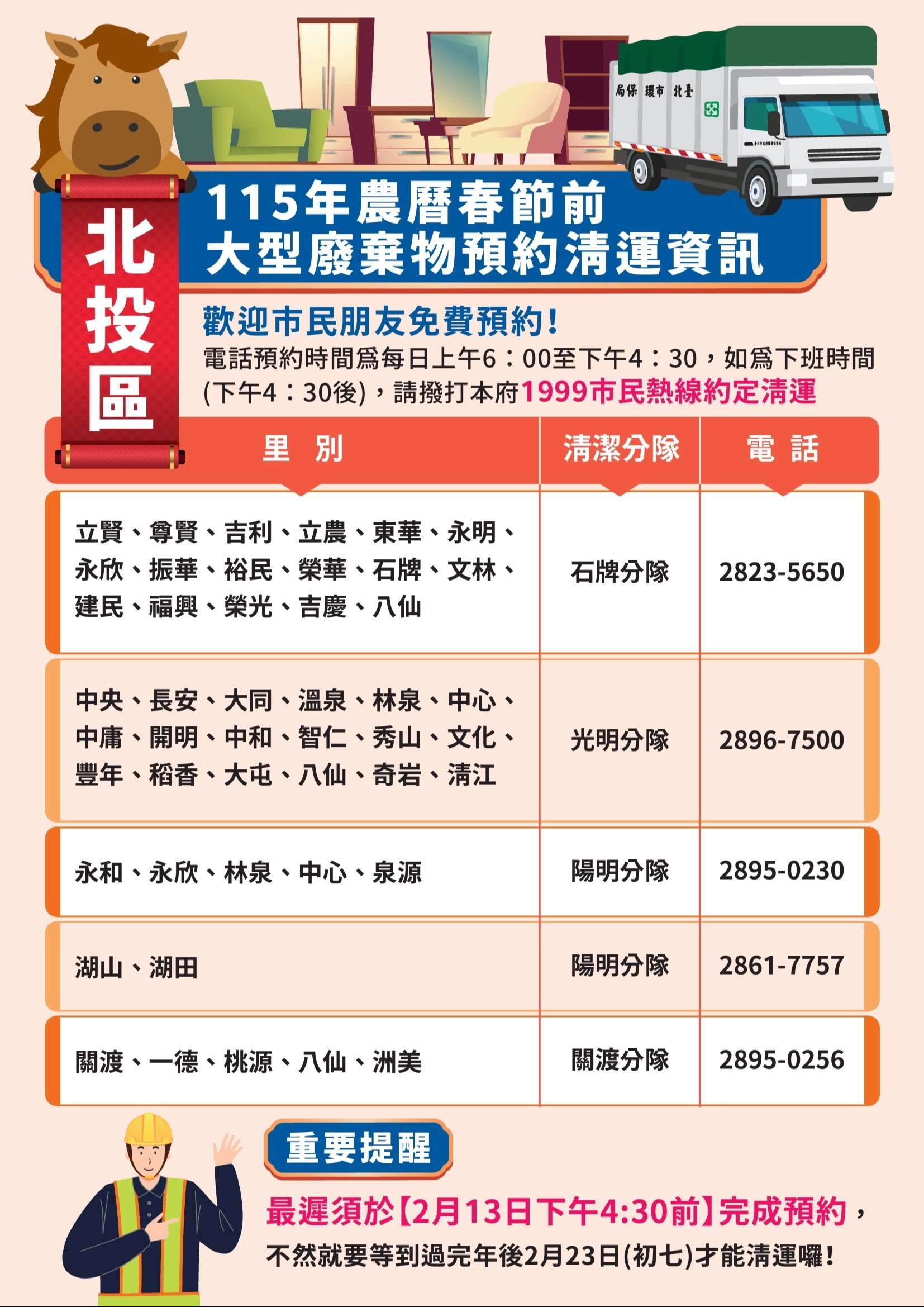 二、檢附115年春節期間垃圾清運資訊宣傳單暨北投區大型廢棄物預約清運資訊宣傳單各1份。