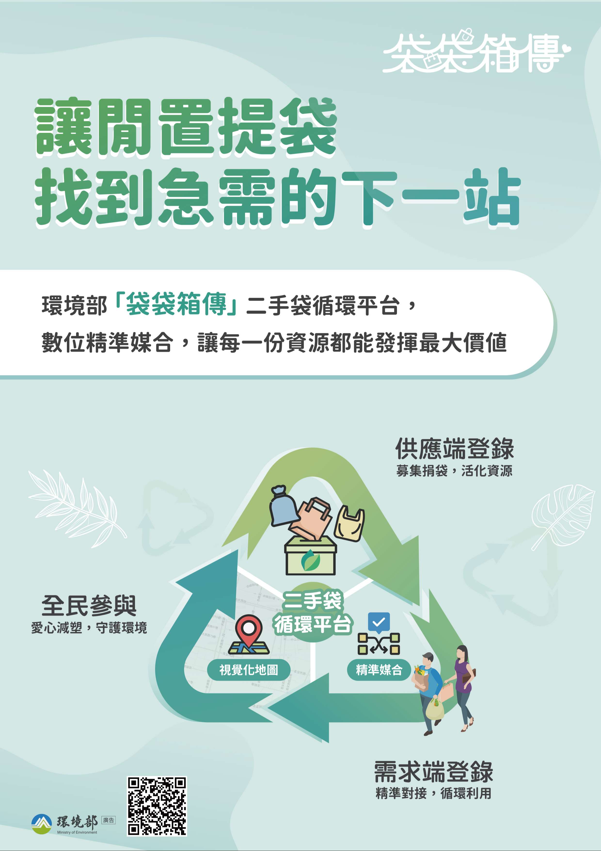 二、為因應全球原物料及環境的挑戰,環境部建置「袋袋箱傳」二手袋循環平台(https://sup.moenv.gov.tw/Page/rebag),期公私協力透過該平台連結可提供二手袋的企業與需要二手袋的商家,讓二手紙袋及購物袋循環流動,實現「減廢、省錢、護地球」的共贏生活圈。